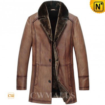 Cwmalls genuine shearling coat for men, crafted from quality imported calfskin leather shell with lamb fur shearling lining for extra warmth when the temperature plummet, featured in notched collar button closure, nice cutting and stitching, this handsome shearling coat is a good choice for winter season